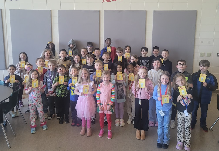 These students were chosen by their classroom teachers for this past month for “sticking together” and setting a positive example. We called them down to the cafeteria and gave each of them one of the gold tokens for our book vending machine they were able to use to choose a book to keep. We are so proud of these great kids and the great choices they make each day!